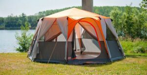 This family tent is as big as your garage. It has a desk 22 m2. I think there is a car or an entire Kelly Familly. This is, of course, a joke, but if someone goes with relatives or children of 5, it will be great — an ideal hangar for long-term camping in one place.